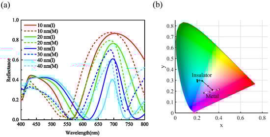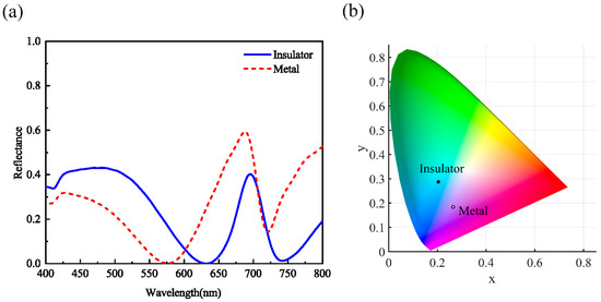 The reflectance spectra of the FROC device are presented in Figure 4a, demonstrating variations induced by changes in the device temperature that facilitate phase transitions in VO2. This spectral result exhibits an asymmetric line characteristic of Fano resonance phenomena in the long-wavelength region of the spectrum. A comparative analysis with the reflection spectra from both broadband and narrowband filters indicates that within the short-wavelength region of the visible spectrum, the reflection spectra of the device primarily originated from the upper broadband filter, and there is minimal impact on performance due to a trough observed around 440 nm in the narrowband filter. In contrast, within the long-wavelength range of the visible spectrum, both the two filters are effectively coupled to excite Fano resonance effects, resulting in resonance peaks appearing at wavelengths of approximately 695 nm and 688 nm, with a reflectance peak reaching up to 40.2% when VO2 exists in its insulating state and increasing to 59.3% when it transitions into its metallic state, respectively. Their corresponding chromaticity coordinates have been calculated from the spectral data and plotted in the CIE1931 chromaticity diagram. As illustrated in Figure 4b, by modulating the phase transition state of VO2, the device demonstrates its capability to reflect two distinct colors, blue and fuchsia, with a chromatic difference ∆E2000 as high as 36.7. Compared with the existing FROC design, this device can maintain good color saturation while maintaining an excellent dynamic color rendering range.