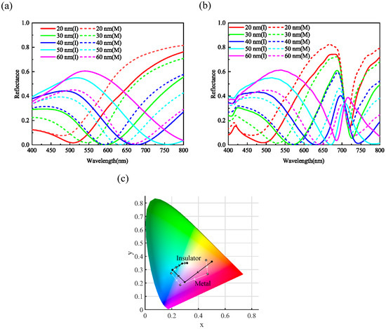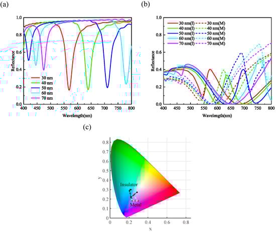 Varying the thickness of the Si layer (h4), we observed that as the thickness of the Si layer increases from 30 nm to 70 nm at a step of 10 nm, the reflection spectra of the narrowband filter are as shown in Figure 8a. The results of the reflection spectra of the FROC devices are shown in Figure 8b. A red shift occurs in the narrowband filter spectra with the increase in the Si layer, accompanied by an enlargement of the reflection troughs located within the short-wavelength band. In contrast, a similar red shift is observed for the position of the Fano resonance peak within the reflection spectrum of the FROC, when compared to that of the narrowband filter. Their corresponding chromaticity coordinates were calculated from the spectral data of Figure 8b and plotted in the CIE1931 chromaticity diagram, as illustrated in Figure 8c. When VO2 is in its insulating state and h4 increases from 30 nm to 70 nm at a step of 10 nm, the sequentially recorded chromaticity coordinates for FROC are (0.283, 0.271), (0.219, 0.222), (0.204, 0.287), (0.212, 0.300), and (0.220, 0.300). And when VO2 transitions into its metallic state, the chromaticity coordinates are (0.247, 0.239), (0.295, 0.181), (0.264, 0.183), (0.234, 0.182), and (0.225, 0.208). Although variations in the thickness of the Si layer significantly affect the reflectance spectrum of the device, they exert only a minor influence on the color coordinates of the device; thus, it can be concluded that the colors of the FROC predominantly reside within blue (insulating state) versus fuchsia (metallic state) regions.