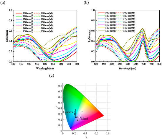 The reflectance spectra of the broadband filter are presented in Figure 7a as the length L of the top square mesh is varied from 190 nm to 130 nm at a step of 10 nm. The results for the reflectance spectra of the FROC device are shown in Figure 7b. The length of L was altered to change the duty cycle of the silver mesh while maintaining a constant period P. The duty cycle is defined as , where L is the length of the square mesh and P is the period of the device. As L decreases, the duty cycle gradually increases, which leads to both a blue shift in the spectrum and an increased reflectance intensity for the broadband filter. The reflectance spectrum of the FROC exhibits a similar trend to that observed with the broadband filter; however, it is noteworthy that while its position remains essentially unchanged, this pertains specifically to where Fano resonance peaks occur within the long-wavelength band. The corresponding chromaticity coordinates derived from the spectral data depicted in Figure 7b have been calculated and plotted in the CIE1931 chromaticity diagram, as illustrated in Figure 7c. When VO2 is in its insulating state and L decreases from 190 nm to 130 nm at a step of 10 nm, the sequentially recorded chromaticity coordinates for the FROC are (0.220, 0.315), (0.204, 0.287), (0.200, 0.264), (0.228, 0.372), (0.228, 0.239), (0.242, 0.242), and (0.264, 0.243). And when VO2 transitions into its metallic state, the chromaticity coordinates are (0.267, 0.193), (0.264, 0.183), (0.268, 0.185), (0.345, 0.337), (0.279, 0.210), (0.288, 0.226), and (0.314, 0.239). The colors reflected from the device predominantly fall within both blue and fuchsia regions. It is worth noting that when L is set to 160 nm, the device reflects blue-green (insulating state), and yellowish (metallic state), exhibiting a color difference ∆E2000 up to 28.1.