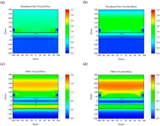 Electric field distributions of the broadband filter in the x-z plane; (a) wavelength of 695 nm light normally illustrated on VO2 (insulating state); (b) wavelength of 688 nm light vertically irradiates on VO2 (metallic state). Electric field distributions of the FROC in the x-z plane; (c) wavelength of 695 nm light vertically irradiates on VO2 (insulating state); (d) wavelength of 688 nm light vertically irradiates on VO2 (metallic state). The structures of the broadband filter and FROC depicted by the solid black lines are shown in the figure.