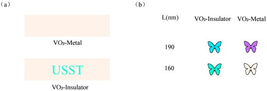 Based on the aforementioned analysis of the FROC performance, the device is initially investigated for applications in color display and anti-counterfeiting. As shown in Figure 10a, the pattern of “USST” consists of FROC arrays, where L is set to 160 nm while the remaining sections of the square grid are left unprepared (L is set to 0). The “USST” pattern becomes distinctly visible when VO2 is in its metallic state; however, it nearly completely vanishes after the heating phase transition. This observation indicates that when VO2 is in its metal state, the “USST” character is obvious, whereas after undergoing a phase change, the pattern almost entirely disappears. This phenomenon highlights the potential application of the device in the field of anti-counterfeiting. As depicted in Figure 10b, by merely varying the length L of the square grid (190 nm vs. 160 nm) along with the temperature adjustments, the device can reflect four distinct colors, blue, purple, green, and yellowish, which shows the potential utility of the device in color display applications.