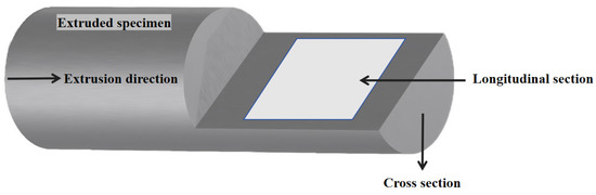 Samples (10 mm × 10 mm × 6 mm) were cut from the as-extruded bars, as shown in Figure 1. The surface of the specimens was sequentially polished using SiC abrasive papers ranging from 400# to 5000# and subsequently subjected to mechanical polishing, achieving a smooth and uniform finish to ensure reliable testing conditions. The microstructure and phases were observed using optical microscopy (OM) and scanning electron microscopy with energy dispersive spectroscopy (SEM/EDS) at an accelerating voltage of 10 kV. Phase identification was conducted using X-ray diffraction (XRD). The crystal orientation and grain size of the microzone were analyzed using electron backscatter diffraction (EBSD) with a step size of 0.5 μm, and Channel 5 v5.12 software was utilized for data interpretation.
