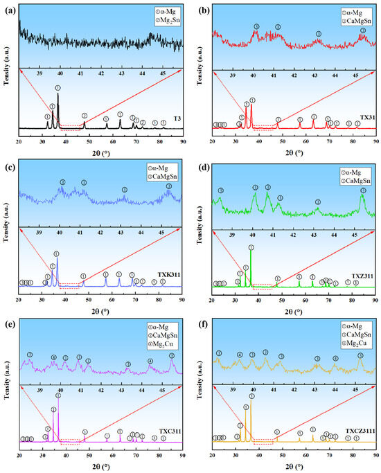 XRD patterns of six as-extruded alloys: (a) T3, (b) TX31, (c) TXK311, (d) TXZ311, (e) TXC311, and (f) TXCZ3111.