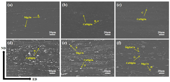SEM images of six as-extruded alloys: (a) T3, (b) TX31, (c) TXK311, (d) TXZ311, (e) TXC311, and (f) TXCZ3111.