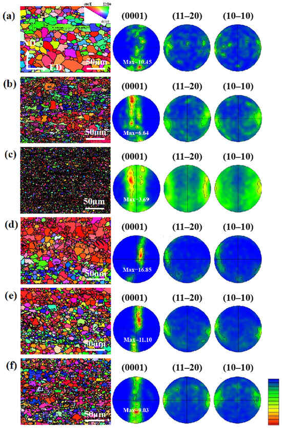 Inverse pole figure maps and pole figures: (a) T3, (b) TX31, (c) TXK311, (d) TXZ311, (e) TXC311, and (f) TXCZ3111.