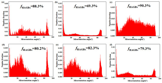 Misorientation angle area fraction distribution: (a) T3, (b) TX31, (c) TXK311, (d) TXZ311, (e) TXC311, and (f) TXCZ3111.
