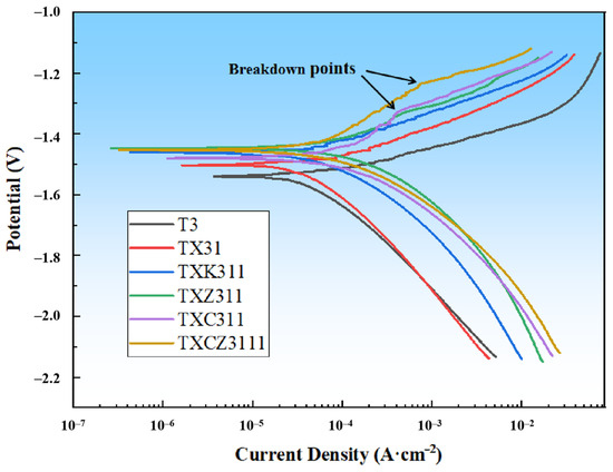 Figure 6 illustrates the polarization curve. The Ecorr obtained from the polarization curve represented a thermodynamic parameter, while icorr served as a dynamic parameter that quantified the corrosion rate of materials. In practical applications, icorr was mainly intended to characterize the corrosion properties of materials. The fitting values of Ecorr and icorr in Figure 6 are indicated in Table 4. The alloys were ranked in terms of corrosion current density as follows: TXZ311 < TXK311 < T3 < TX31 < TXCZ3111 < TXC311. According to Equation (2), the TXZ311 alloy had the lowest corrosion rate. Obvious breakdown points of the passive film were detected on the anode curves of the TXC311 and TXCZ3111 alloys. When the voltage surpassed the breakdown potential, the self-corrosion current density of both alloys increased significantly. Generally, the more positive the voltage at which the alloy reached the breakdown potential, the slower the increase in the self-corrosion current density. Accordingly, the increase in the self-corrosion current density for the TXCZ3111 alloy was slower than that of the TXC311 alloy, indicating that the passive film on the TXCZ3111 alloy exhibited better corrosion resistance. However, once the breakdown potential was exceeded, cracks formed in the corrosion product films on both alloys, leading to a substantial increase in their self-corrosion current densities. This implied that the passive film had broken down, which would have hastened the corrosion of the alloy [16].
