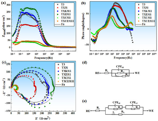 The EIS plots of six as-extruded alloys: (a) Bode diagram, (b) phase angle diagram, (c) Nyquist curves, and (d,e) equivalent circuit diagram.