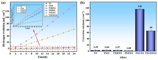 Figure 8 depicts the H2 evolution volume and the average corrosion rate. In Figure 8a, the H2 evolution volume of the T3, TX31, TXK311, and TXZ311 alloys slowed down after immersing for 12 h, while the H2 precipitation volumes of the TXC311 and TXCZ3111 alloys remained relatively stable. As depicted in Figure 8b, the order of corrosion rates was TXZ311 < TXK311 < T3 < TX31 < TXCZ3111 < TXC311, which was consistent with the results of EIS.