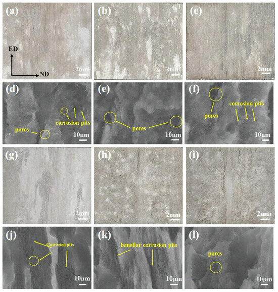 Figure 9 presents the surface macroscopic and SEM images of the alloy that had been immersed for 24 h to remove corrosion products. The macroscopic image revealed that the as-extruded alloy exhibited corrosion marks along the extrusion direction. Among these, the TXZ311 alloy was the least corroded, whereas the TXC311 alloy was the most severely corroded. The surfaces of the six alloys exhibited pits of varying depths of corrosion. Due to the inhomogeneity in the grain structure, many localized deep pits were observed in the ED direction of the TX31 alloy. In contrast, the corrosion process had been relatively uniform for the T3 and TXK311 alloys, whereas localized corrosion pits were only found in the TXZ311 alloy. Deeper lamellar corrosion pits had been observed in the TXC311 and TXCZ3111 alloys, which exhibited the most severe corrosion. These findings indicated that the TXZ311 alloy exhibited superior corrosion resistance.