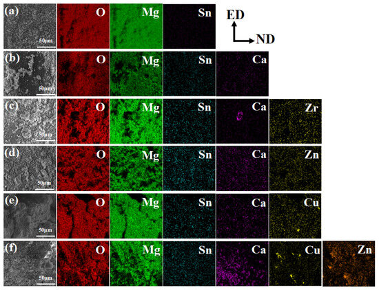 Figure 2 and Figure 3 depict the XRD patterns and SEM images of the alloys, respectively. According to the XRD analysis, only the Mg2Sn phase was detected in the T3 alloy, while only the CaMgSn phase was identified in the TX31, TXK311, and TXZ311 alloys. In contrast, both the CaMgSn and Mg2Cu phases were observed in the TXC311 and TXCZ3111 alloys. As observed in Figure 3, the white particles were aligned along the extrusion direction (ED). This is attributed to the fragmentation of the second phase during the extrusion process, resulting in fine, micron-sized second-phase particles, which were aligned into linear second-phase bands due to the plastic flow of the Mg matrix. The second-phase particles were quantified as shown in Table 2, and the EDS data from the SEM images are presented in Table 3. The area fraction of white particles in the TX31 alloy was 7.5%. The addition of Zr in the TX31 alloy did not change the type of second-phase particles, but the area fraction of white particles decreased to 2.1%. However, the area fraction of white particles in the TXZ311 alloy increased to 11.0% compared to the TX31 alloy. The same CaMgSn and Mg2Cu phases were present in the TXCZ3111 alloy as in the TXC311 alloy, but the area fraction of white particles was slightly increased. In addition, the enrichment of Mg, Zn, and Cu was detected in the TXCZ3111 alloy. Based on previous research, this was inferred to be the MgZnCu phase [15].