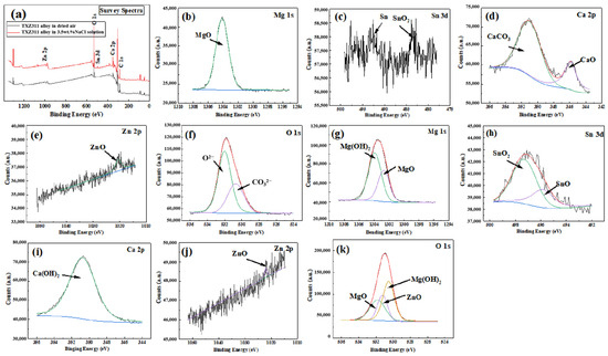 XPS analysis of the TXZ311 alloy: (a) survey spectrum, (b–f) binding energy of Mg 1s, Sn 3d, Ca 2p, Zn2p, and O 1s in dry air, respectively, and (g–k) binding energy of Mg 1s, Sn 3d, Ca 2p, Zn2p, and O 1s in 3.5wt.%NaCl solution, respectively.