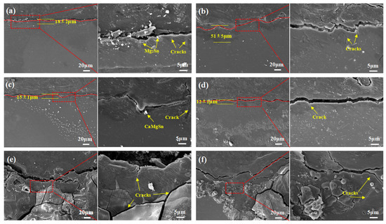 The corrosion properties of the six alloys were ranked as follows: TXZ311 > TXK311 > T3 > TX31 > TXCZ3111 > TXC311. The addition of Ca and Cu increased the corrosion rates of the T3 and TX31 alloys, respectively. The corrosion rate of the TX31 alloy was significantly reduced by the addition of Zn and Zr. In the T3 alloy, the white phase area fraction was only 2.5%; therefore, less galvanic corrosion occurred. From the longitudinal section corrosion morphology in Figure 12a, it was observed that the Mg2Sn phase hindered the deepening of corrosion. The white phase area of the TX31 alloy increased by 7.5% compared to the T3 alloy. In the TX31 alloy, the increase in the CaMgSn phase caused elevated galvanic corrosion, and no obvious white phases were found in the longitudinal section corrosion cracks shown in Figure 12b. After adding Zr, the grain size and area fraction of the second phase of the TX31 alloy decreased to the lowest values, 1.8 μm and 2.1%, respectively. The corrosion performance of the TXK311 alloy was enhanced due to the refined grain size and the decreased area fraction of the white phase. As demonstrated in Figure 12c, the fine CaMgSn phase hindered the deepening of the erosion crack. The TXC311 and TXCZ3111 alloys were the most severely corroded due to the higher potential of the Mg2Cu phase (−1.69), which caused α-Mg and the Mg2Cu phase to create micro-galvanic corrosion, reducing the alloy’s resistance to corrosion [33]. In the TXCZ3111 alloy, a small percentage of the produced MgZnCu phase consumed the Mg2Cu phase, thereby improving the corrosion resistance of the alloy [34].