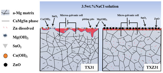Corrosion schematic model of the TX31 and TXZ311 alloys.
