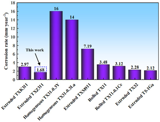 - The TXZ311 alloy exhibited the best corrosion resistance, with a corrosion rate of only 1.68 mm·year−1. This alloy had a higher HAGBs fraction and greater matrix texture intensity. The formation of ZnO within the corrosion product film of the TXZ311 alloy filled the voids created by Mg(OH)2, thereby enhancing the film’s stability. The synergistic effect of these factors contributed significantly to the improved corrosion resistance of the TXZ311 Mg alloy.