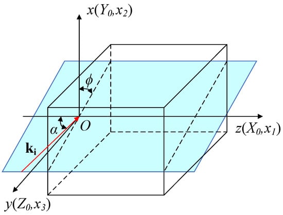 In the geometric coordinate system O-xyz of LiNbO3 crystals, an incident ray ki enters the crystal from the air, and the angle between the negative direction of the ray in the z-axis is called the angle of incidence α, and the angle between the ray in the positive direction of the x-axis is called the azimuth ϕ. Thus, the incident ray ki can be expressed as follows: