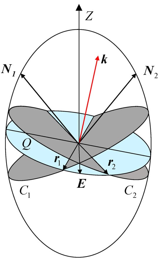 The 3D coordinates of the unit direction vectors of the optic axes N1 and N2 are denoted as and , respectively. is the angle between the optic axis and the Z-axis, which can be expressed as follows: