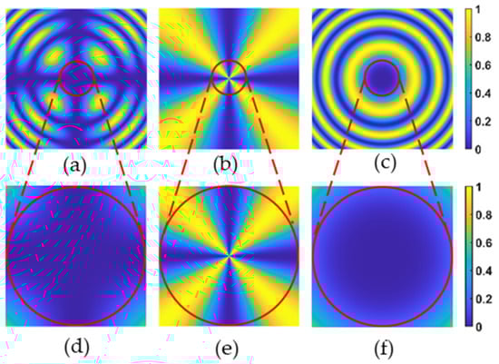 Crystal conoscopic interferogram when V = Vπ: (a) interference light intensity distribution; (b) influence of polarization direction on light intensity ; (c) influence of phase difference on light intensity ; (d–f) is a magnification of the field of view at the center of (a–c) of the figure.