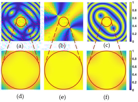 Figure 8d shows that the light intensity within 1° of the field of view is greater than 0.87, and the electro-optical modulation is considered to be bright at this time. However, the aberration at the edge of the field of view is large, and the source of the aberration is analyzed according to the interference intensity formula. In Figure 8e, the range of light intensity is 0.95–1; Figure 8f shows that the range of light intensity is 0.86–1. Therefore, the polarization direction has little effect on the light intensity within the 1° field of view, and the non-uniformity of the light intensity is mainly related to the phase difference .
