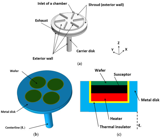 The rotating wafer carrier disk includes four 2-inch wafers, four heaters, four insulated zones, four susceptors (between the heaters and wafers), a disk, and a shaft (see Figure 1b,c). The disk rotates in a clockwise direction when viewed top down.