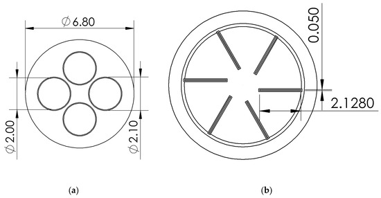 The six individual gas source chambers (precursor zones) in the shroud are defined by radial-oriented, slightly curved separating barriers and are of identical design defining volumes. There is a gap filled with fluid between the bottom of the barrier and the rotating carrier disk. This is the mixing/boundary layer through which the gases diffuse prior to reacting and depositing on the wafer. The current gap (vertical distance between the top of disk and the lower part of the barrier) in this design was set to 0.12 inch. This gap size was established through system optimization, ranging from 0.06 inches to 0.18 inches, in order to achieve an optimal flow pattern while considering fixed boundary conditions. The thickness value of the wafer, susceptor, heater, and thermal insulation in Figure 1c is 0.013-inch, 0.1-inch, 0.2-inch, and 0.05-inch, respectively, while additional dimensions of the system are provided in Figure 2a,b. The shroud is made of molybdenum with a thickness of 4 mm.