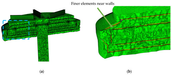The numerical domain was discretized to form a grid of around 2.7 million elements. The grid was refined near the walls to accurately resolve the boundary layers. The general view of mesh within the numerical domain and in the vicinity of walls is illustrated in Figure 3.