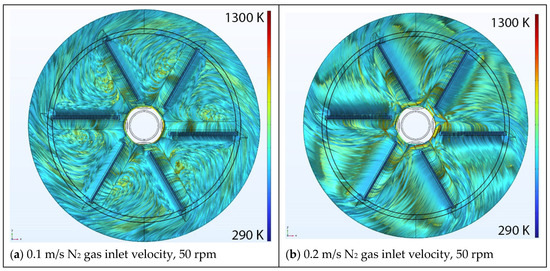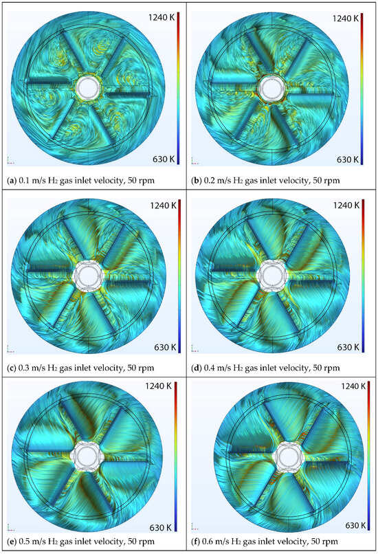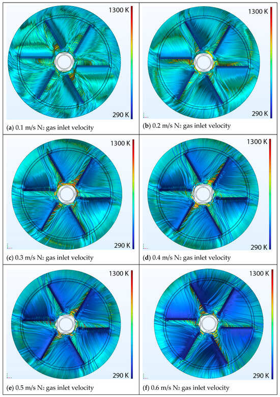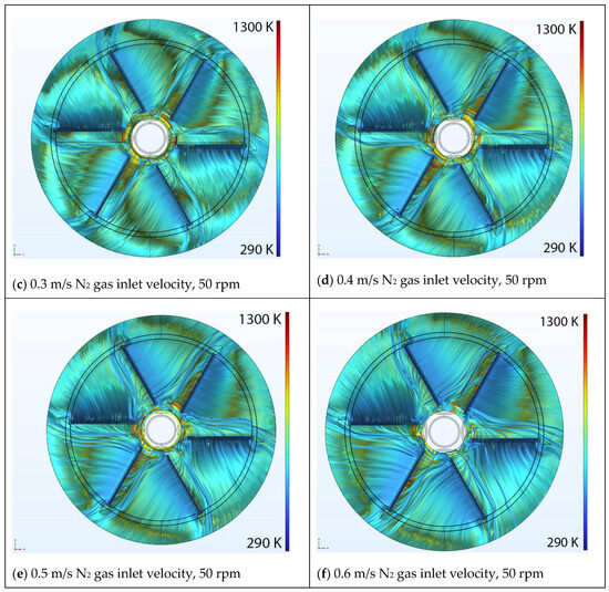 Figure 4 shows the circulation of nitrogen (N2) inside the numerical domain for a fixed value of 50 rpm (rotational speed of the carrier disk) and six inlet velocity values; 0.1, 0.2, 0.3, 0.4, 0.5, or 0.6 m/s. Note that the velocity streamlines are temperature color-coded in this figure and the red–blue spectrum in the legend bar corresponds to higher and lower temperatures, respectively. The authors considered 10,000 streamlines for the entire system to better reflect the physics of the problem, as fluid is a continuous medium and additional streamline could mimic the flow patterns with a higher accuracy level. Although one could consider a lower number of streamlines (for example 1000 streamlines), some details of the flow patterns could be missed. The selection of 10,000 streamlines was based on several internal studies (considering 500, 100, 2500, 5000, 10,000, or 50,000 streamlines), resulting in the conclusion that 10,000 streamlines adequately capture the existence of instabilities in the flow pattern, and a higher number of streamlines did not visualize any new information.