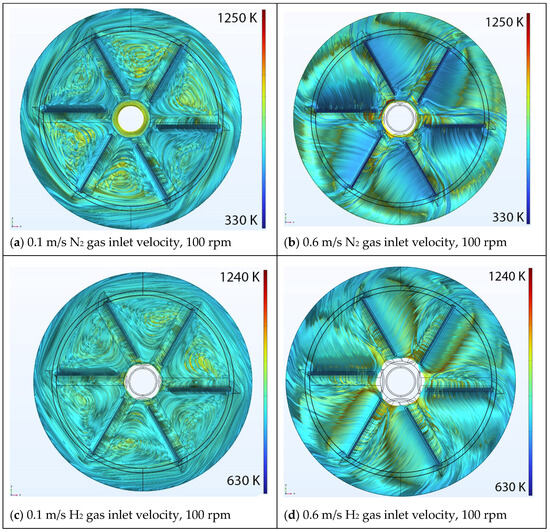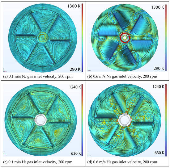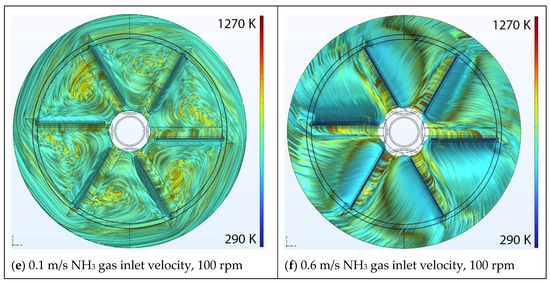 Figure 7 and Figure 8 present the flow patterns inside the reactor, using 10,000 temperature color-coded streamlines, for the three different gases for two different inlet velocity inputs (0.1 m/s and 0.6 m/s) at a disk rotation speed of 100 rpm and 200 rpm, respectively. The majority of the chaotic movements on top of the wafers disappeared by increasing the inlet velocity magnitude for all N2, H2, NH3 simulations. The existence of minor, local disturbances in the center of the disk are similarly observed with a similar minor contribution to the flow pattern.