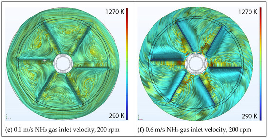Top view of 10,000 temperature color-coded velocity streamlines within the chambers at 1 atm, a disk rotation of 200 rpm and gas type and inlet velocities of (a) N2, 0.1 m/s (b) N2, 0.6 m/s (c) H2, 0.1 m/s (d) H2, 0.6 m/s, (e) NH3, 0.1 m/s, and (f) NH3, 0.6 m/s, respectively.