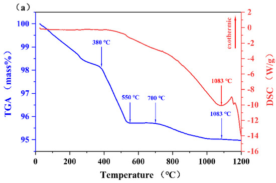 The particle size distribution of the powder was determined using a laser diffraction particle size analyzer (Mastersizer 2000, Malvern, UK), mixed with a small amount of water, and the refractive index of the powder was adjusted to 1.7. The phase composition of the sample was tested using an X-ray diffractometer (XRD, D8-Advance, Bruker, Germany), in which the scanning angle was 10~70°, and the step length was 0.02°. Thermal analysis of the samples was performed using a synchronous thermal analyzer (TGA/DSC3+, Mettler Toledo, Greifensee, Switzerland) in an air environment ranging from room temperature to 1200 °C, with a heating rate of 10 °C/min.