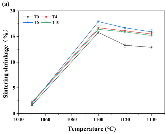 However, the excessive addition of TiO2 may have the opposite effect. When the TiO2 content increases from 6 wt% to 10 wt%, the amounts of the liquid-phase products decrease (Figure 6e). At higher temperatures, TiO2 can act as an intermediate oxide within the glass system, replacing Si4+ in the silicon-oxygen tetrahedral structure and forming coordination bonds with O2−. This process disrupts the intricate silicon–oxygen tetrahedral network. Consequently, excessive doping of TiO2 can significantly decrease the viscosity of glass [50]. However, when TiO2 is appropriately doped, it can effectively reduce viscosity and improve the fluidity of the glass. Severely reduced viscosity of the glass results in macroscopic deformation of the sample. The sample will experience severe deformation following sintering at an elevated temperature, such as 1160 °C. Furthermore, although the reduction in glass viscosity and increase in the liquid-phase content promote element migration within the glass system [51,52] and enhance the mass transfer processes, an excessive amount of TiO2 can react with the Mg2+ present in the low-melting-point magnesia solid solution or pyroxene to form magnesium dititanate (MgTi2O5) [53,54] (as indicated by the XRD curve of T10 shown in Figure 3). As mentioned previously, an excess of evaporating substances during sintering can impede mass transfer. Similarly, an excess of the molten state can hinder gas discharge and increase the trapped gas pressure within the closed pores. This results in a higher number of closed pores, which inevitably have a detrimental effect on the sintering pattern performance. A significant increase and expansion of the internal pores are evident in T10 (Figure 5e). Consequently, the inclusion of excessive TiO2 doping in T10 leads to a significant deterioration in its properties, including shrinkage, relative density, and mechanical characteristics when compared to T6.