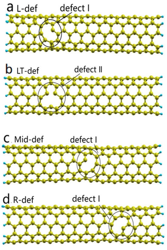 - Saidi, W.A.; Norman, P. Spectroscopic signatures of topological and diatom-vacancy defects in single-walled carbon nanotubes. Phys. Chem. Chem. Phys. 2014, 16, 1479–1486. [Google Scholar] [CrossRef] [PubMed]