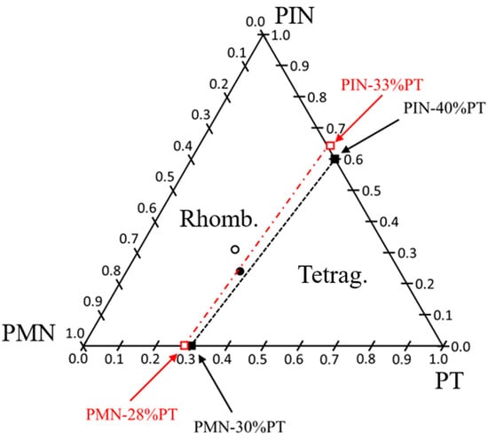 Single crystal wafers in 24PIN–46PMN–30PT and 31PIN–43PMN–26PT near MPB were grown by the Bridgman technique [40]. Figure 1 shows the phase diagram of the ternary system of PIN–PMN–PT at room temperature, where 24PIN–46PMN–30PT and 31PIN–43PMN–26PT are shown by the solid and open circles, respectively. The straight dashed–dotted line connects the triple points in PIN–PT and PMN–PT, and the straight dotted line connects MPB at room temperature in PIN–PT and PMN–PT [4,5]. It is conjectured from Figure 1 that both materials are located near MPB and show phase sequences of cubic–rhombohedral and cubic–tetragonal–rhombohedral in 24PIN–46PMN–30PT and 31PIN–43PMN–26PT, respectively.