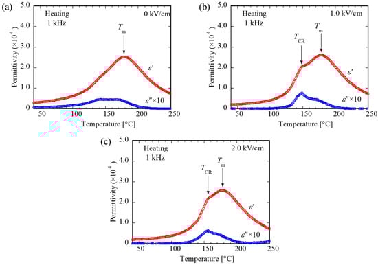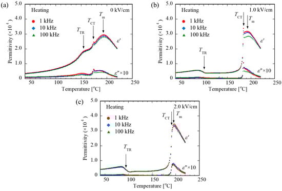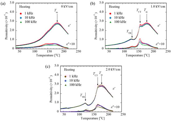 The temperature dependences of permittivity under the DC biasing fields of 0, 1.0, and 2.0 kV/cm along the [001]c direction in 31PIN–43PMN–26PT are respectively shown in Figure 5a–c as typical examples. It is seen that only the temperature Tm showing the maximum permittivity is found in Figure 5a, whereas three dielectric anomalies at Tm, TCT, and TTR appear in Figure 5b,c. The temperatures TCT and TTR strongly depend on the electric field strength, and the temperature interval between TCT and TTR widens with increasing field strength, whereas the temperature Tm does not depend on the field strength within an experimental error. Consequently, TCT and TTR are determined to be the transition temperatures between the cubic and tetragonal phases and between the tetragonal and rhombohedral phases, respectively, and Tm does not indicate a ferroelectric phase transition.