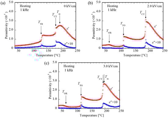 In general, the ferroelectric transition temperature depends on the direction and strength of the biasing field, because the electric field is the conjugate force to the polarization. Indeed, TCT and TTR were confirmed to depend on the biasing field, as shown in Figure 4a,b. However, Tm does not completely depend on the electric field within an experimental error. We considered that at least the temperature Tm at which the permittivity is maximum is not a ferroelectric transition temperature.