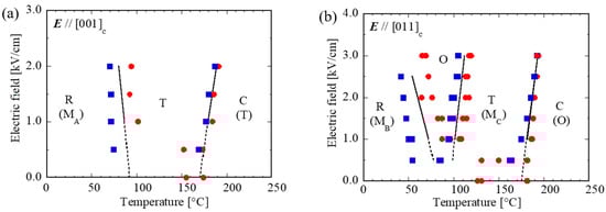 Figure 4a,b show the temperature–field phase diagrams along the [001]c and [011]c directions in 24PIN–46PMN–30PT, respectively. Circles and squares show the transition temperature determined from the permittivity measured on heating and cooling processes, respectively. The letters C, T, O, R, MA, MB, and MC indicate cubic, tetragonal, orthorhombic, rhombohedral, monoclinic A, monoclinic B, and monoclinic C symmetries, respectively [8]. The letters in parentheses show the rigorous symmetry under the electric field along each direction. Experimental results for two samples are shown in Figure 4a,b to confirm sample dependence. It is seen that phase transition temperatures below 1 kV/cm are not consistent with those above 1 kV/cm owing to the relaxor nature of the diffuse phase transition. The assignment of the symmetry in the ferroelectric phases will be discussed in Section 4.1.