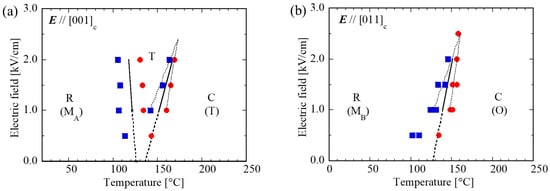 Figure 7a,b show the temperature–field phase diagrams along the [001]c and [011]c directions in 31PIN–43PMN–26PT, respectively. Circles and squares show the transition temperatures determined from the permittivity measured during the heating and cooling processes, respectively. The letters C, T, O, R, MA, and MB indicate cubic, tetragonal, orthorhombic, rhombohedral, monoclinic A, and monoclinic B symmetries, respectively [8]. The letters in parentheses show the rigorous symmetry under the electric field along each direction. To confirm sample dependence, the results of the transition temperature for two samples are shown in Figure 7b. It is seen that phase transition temperatures below 1 kV/cm are not consistent with those above 1 kV/cm owing to the relaxor nature of the diffuse phase transition. The assignment of the symmetry in the ferroelectric phases will be discussed in Section 4.1.