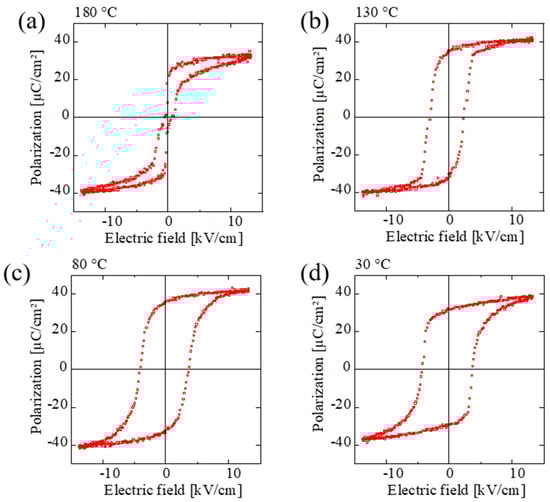 Figure 8a–d show typical examples of the P–E hysteresis loops in different electric fields along the [001]c direction in 24PIN–46PMN–30PT, where the frequency of the electric fields is 1 Hz. The P–E hysteresis loops were measured in the temperature range from 180 to 30 °C during the cooling process. It is considered that in Figure 8a, the imperfect triple-loop pattern basically indicates the field-induced transition in the paraelectric phase. Figure 8b–d show typical P–E hysteresis loops revealing the polarization reversal in the ferroelectric phase.