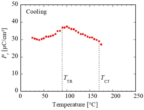 The temperature dependence of remanent polarization determined by the P–E hysteresis loop measurement is shown in Figure 9. The dotted lines indicate the transition temperature determined from Figure 4a, where TCT = 171 °C and TTR = 92 °C (see Section 3.1). At the transition temperature between the tetragonal and rhombohedral phases, an anomaly of the remanent polarization is found, although no jump of the polarization appears. This implies the coexistence of the tetragonal, orthorhombic, and rhombohedral phases.