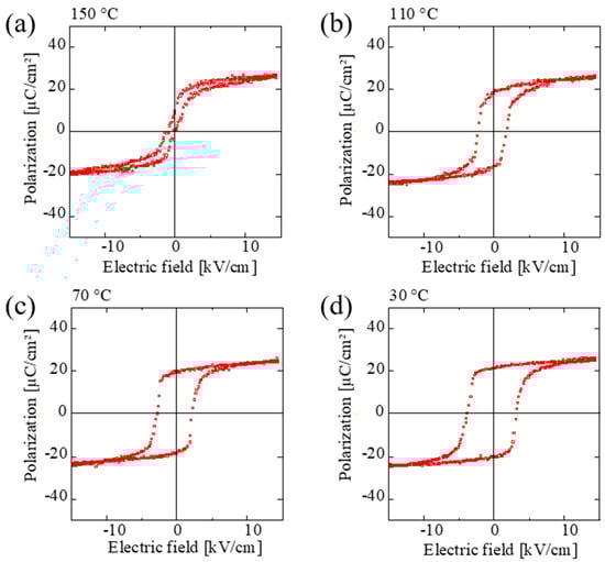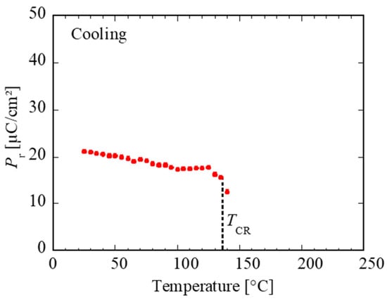 Figure 11 shows the temperature dependence of the remanent polarization obtained by the P–E hysteresis loop measurement, where the dotted line indicates the transition temperature determined from Figure 7b, where TCR = 127 °C (see Section 3.2). Note that in Figure 11, the true polarization value in the rhombohedral phase must be multiplied by .