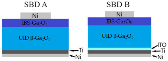 Thus, two types of SBDs with vertical electron transport and different ohmic contacts were fabricated. The series of samples without an ITO layer is denoted as SBD A, and the series of samples with an incorporated ITO layer is denoted as SBD B. Schematic images of the fabricated SBDs are illustrated in Figure 1.