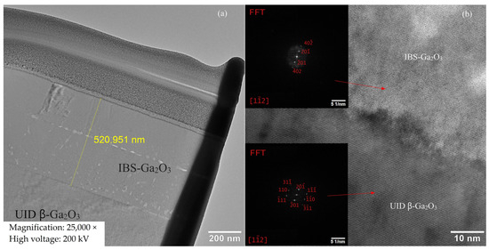 (a) TEM image of IBS Ga2O3/UID β-Ga2O3 structure. (b) HRTEM image of IBS Ga2O3/UID β-Ga2O3 interface. The insertions are the FFT.