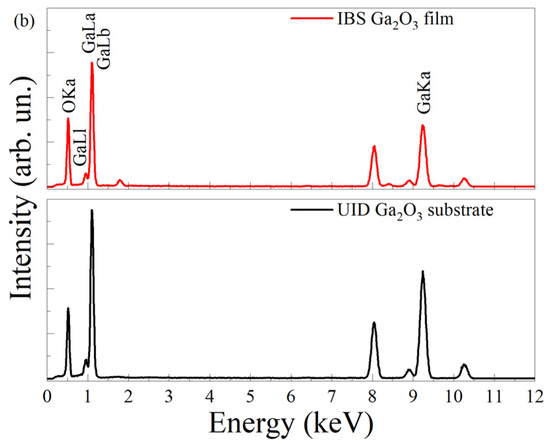 (a) Elementwise TEM EDX mapping of cross-section of IBS Ga2O3/UID β-Ga2O3 interface; (b) EDX spectra for IBS Ga2O3 and UID β-Ga2O3 near the IBS Ga2O3/UID β-Ga2O3 interface.