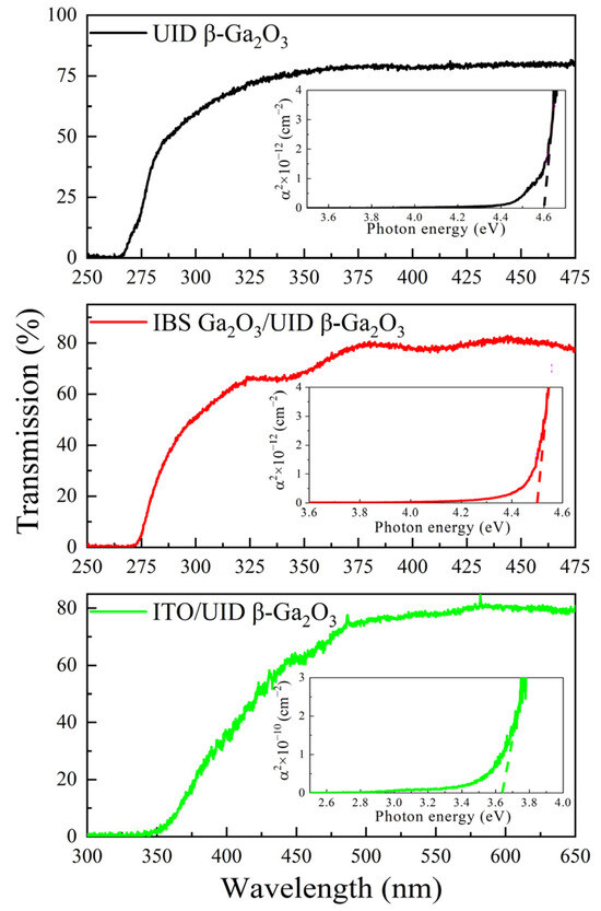 Transmission spectra of UID β-Ga2O3, IBS Ga2O3/UID β-Ga2O3 and ITO/UID β-Ga2O3 structures.