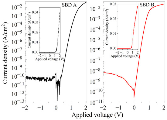 J-V characteristics SBD A and SBD B at RT in double logarithmic coordinates. The insets represent J-V characteristics of SBD A and SBD B at RT in linear coordinates.