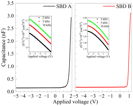 where b is the slope of the reverse branch of the C-V characteristics in the coordinates of S2/C2 vs. V (inset of Figure 6). The C-V characteristics obtained are typical of SBD. The Nd for SBD A and SBD B is (1.7–3.1) × 1017 cm−3. Meanwhile, the value of b did not change with f.