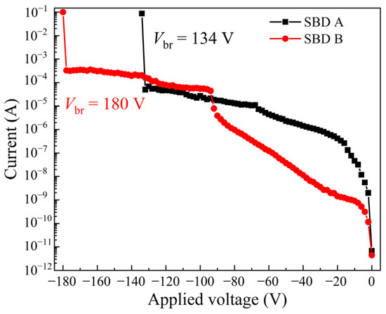 Reverse I-V characteristics of SBD A and SBD B at RT in semi-logarithmic coordinates.