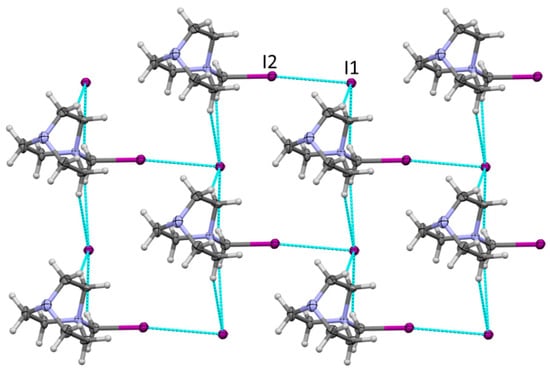 Fragment of the X-ray structure of 1 showing the 2D network formed by halogen and the bonding between DABCO-CH2I+ and iodide. Color code: dark gray—carbon, light gray—hydrogen, blue—nitrogen, purple—iodine. Blue lines show contacts shorter than van der Waals separations.