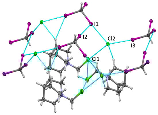 Crystallization of DABCO analogue, QN, with CH3CH2I also resulted in the formation of the products of the Menshutkin reaction, which comprised the salt of iodide anions with QN-CH2CH3+ cations (crystal 5, see Figure S2 in the Supporting Information). In contrast, the previously reported crystallization of this amine with CHI3 in acetonitrile produced co-crystals comprising alternating chains in which CHI3 and DABCO were linked by hydrogen and halogen bonding [27]. The analogous slow crystallization of the mixture of CHI3 and QN in dichloromethane at −20 °C in the current work also resulted in the formation of the crystalline material. The careful examination of this material showed, however, that it contains two types of colorless crystals, i.e., monoclinic crystals (2) and orthorhombic crystals (3). X-ray structural analysis revealed that the monoclinic crystals (2) comprised triiodomethane together with the product of the Menshutkin reaction between DABCO and dicloromethane, i.e., QN-CH2Cl+ and Cl−. They showed halogen bonding between the two iodine substituents of the neutral XB donor, CHI3, and chlorides somewhat similar to the reported earlier interaction of chloride (obtained from the reaction of dichloromethane with DABCO) and iodoperfluorobenzenes (Figure 2).