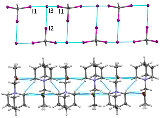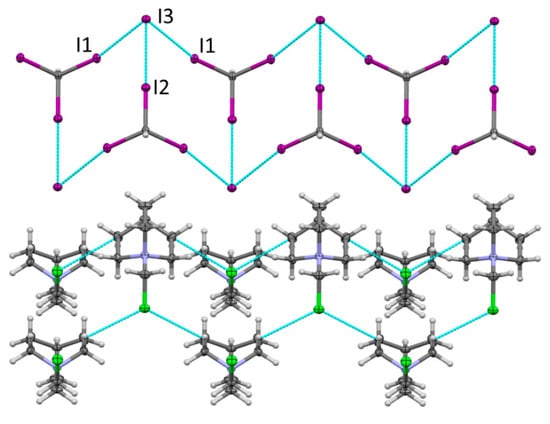 X-ray analysis revealed that the orthorhombic crystals of 3 also comprised DABCO-CH2Cl+ cations and neutral CHI3 molecules (Figure 3). However, instead of Cl− anions in the crystals of 2, the charges of the ammonium cations in the crystals of 3 are balanced by the I− anions (the latter were probably produced by the electron transfer from DABCO to CHI3 in their XB complex accompanied by the dissociation of C-I bond in the resulting anion-radical.) The replacement of Cl− with the larger I− led to considerable changes in the crystal architecture. In the place of the XB networks formed by Cl− with both the cationic and neutral XB donors in 2, the crystals of 3 showed networks of halogen-bonded CHI3 and I− separated by layers of DABCO-CH2Cl+ cations. Specifically, halogen bonding between the three iodine substituents of CHI3 and iodide produced zigzag ladders (Figure 3) similar to those described previously between halide anions and triodo- or tribromomethane [52]. Geometric characteristics of these halogen bonds are listed in Table 1.